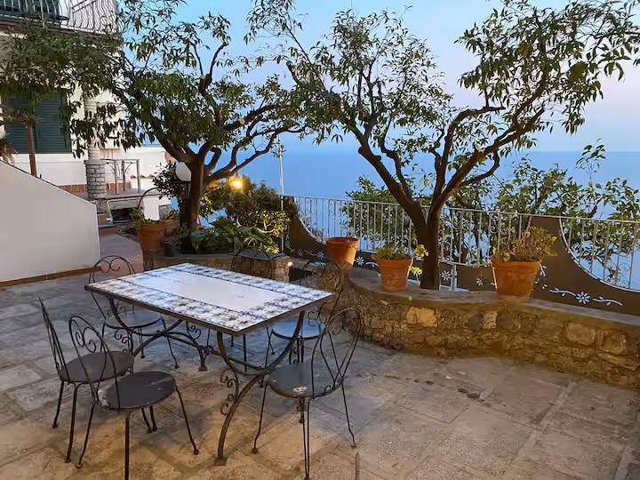 L’accesso privato attraversa un profumato giardino di agrumi con splendide terrazze affacciate sul Mar Tirreno. Per raggiungere la casa dalla strada principale è necessario percorrere circa 80 gradini, tipici delle abitazioni della Costiera Amalfitana.